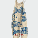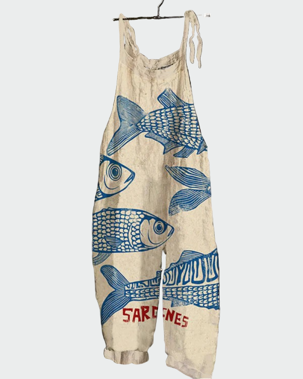 “Thalassines Sardeles” je jednodijelni kombinezon s izraženim umjetničkim dodirom i razigranim karakterom. Bež pozadina u kombinaciji s plavim grafičkim ribama i detaljem “SARDINES” na dnu daje jedinstven, morski ugođaj.