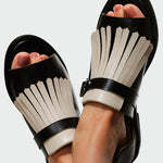 Ove jedinstvene sandale s posebnim dizajnom ističu se svojim inovativnim karakterom i udobnim pristajanjem. Kombinacija crne i bijele boje s elegantnim prugama stvara upečatljiv izgled koji odiše stilom i osobnošću.