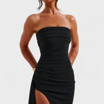 Večernja Haljina Efekt Impakt napravljena je za one koji žele ostaviti trag na svakom događaju. S dizajnom bez naramenica, uskim krojem i strateškim nabiranjem, naglašava obline s sofisticiranošću. Duboki prorez uz lepršavu repnu stvara pokret i stav u svakom koraku. Idealna za posebne prigode gdje su elegancija i glamur obavezni.