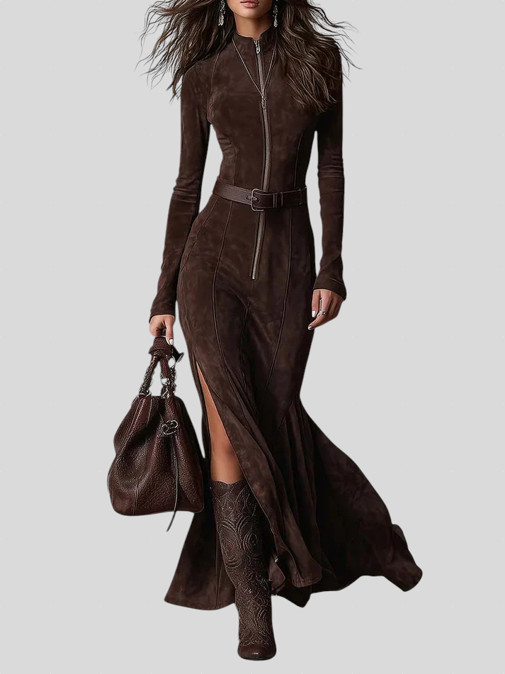 Ova duga vintage haljina spaja sofisticiranost i odvažnost u svakom detalju. S dugim rukavima, modernim prednjim patentnim zatvaračem i remenom koji naglašava struk, jamči moćan i stilski izgled. Lepršavi kroj i bočni prorez donose pokret i senzualnost, pretvarajući svaku priliku u poseban trenutak.