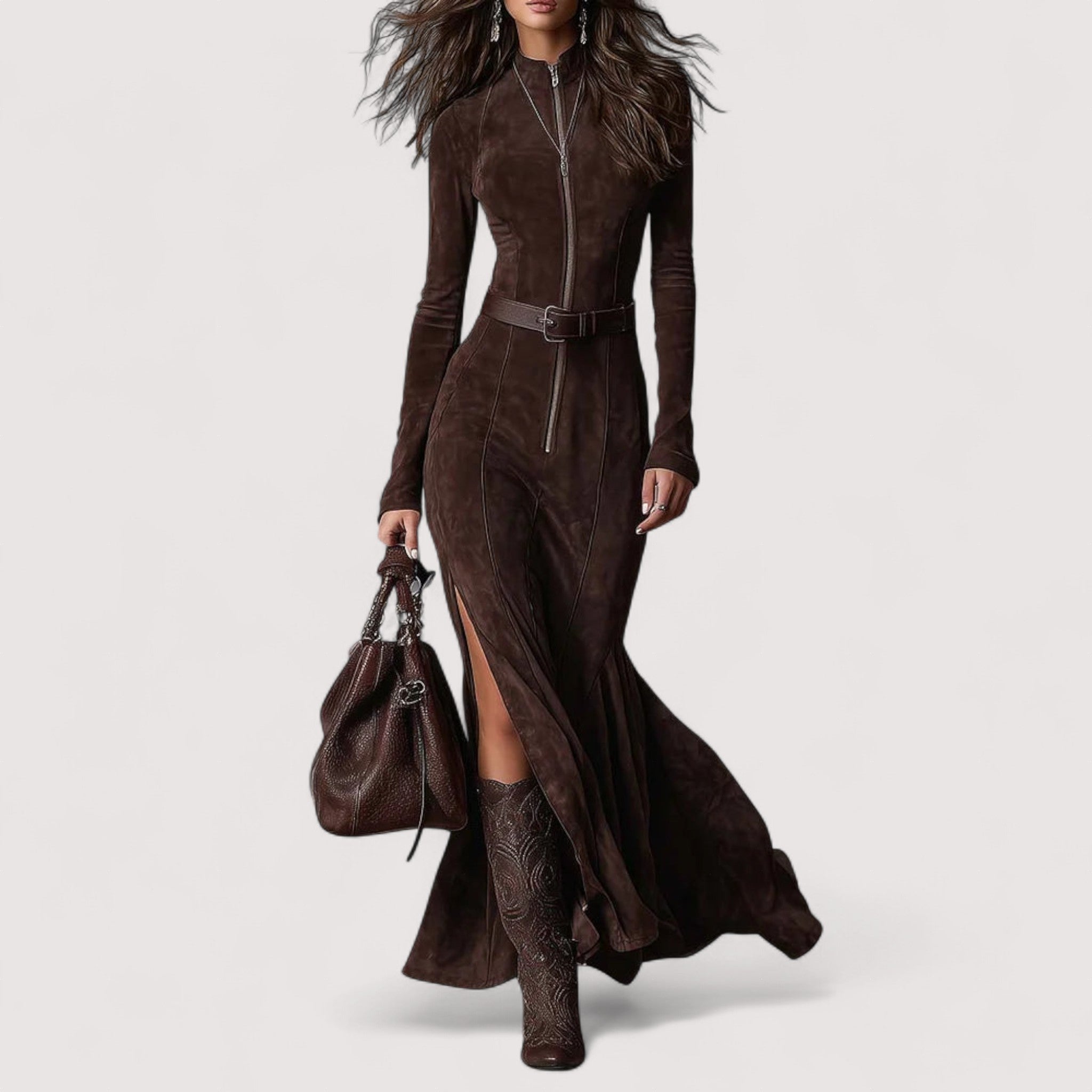 Neris™ | Vintage Smeđa maksi haljina s patentnim zatvaračem i remenom