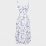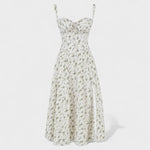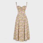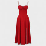 Ova ženstvena midi haljina ističe se savršenim krojem koji naglašava siluetu i pruža profinjen izgled. Elegantni korzetni gornji dio s naramenicama i decentnim detaljima pruža sofisticiran dojam, dok suptilan prorez na donjem dijelu dodaje dašak senzualnosti i slobode pokreta. Idealna je za posebne prilike, večernje izlaske ili romantične trenutke u kojima želite zablistati.