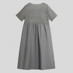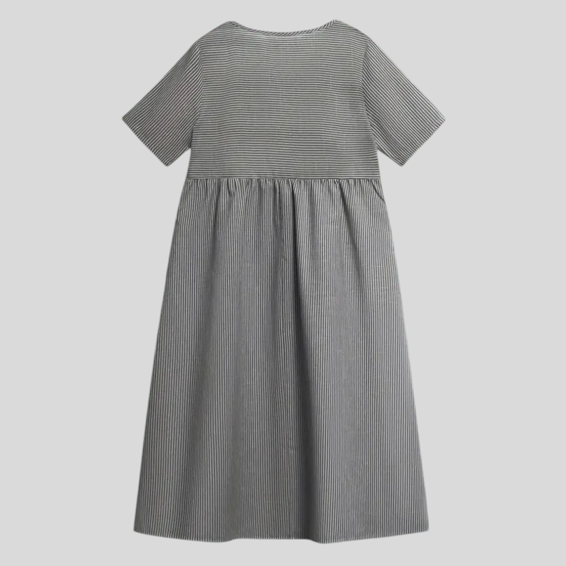 Ova haljina spaja lakoću i praktičnost u modernom dizajnu koji naglašava udobnost bez odricanja od stila. Dekorativni gumbi sprijeda i sa strane daju poseban i profinjen dodir, dok opušteni kroj osigurava slobodu pokreta. Idealna za svakodnevno nošenje, savršen je izbor za ležeran, a istovremeno elegantan izgled.