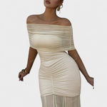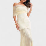 Ova dugačka pletena haljina je oda elegantnoj senzualnosti. S otkrivenim ramenima i uskim krojem, savršeno se prilagođava tijelu, dok prozirna suknja daje fluidnost i sofisticiranost svakom pokretu. To je idealan izbor za isticanje na posebnim događanjima s modernim i odvažnim izgledom.