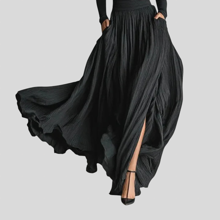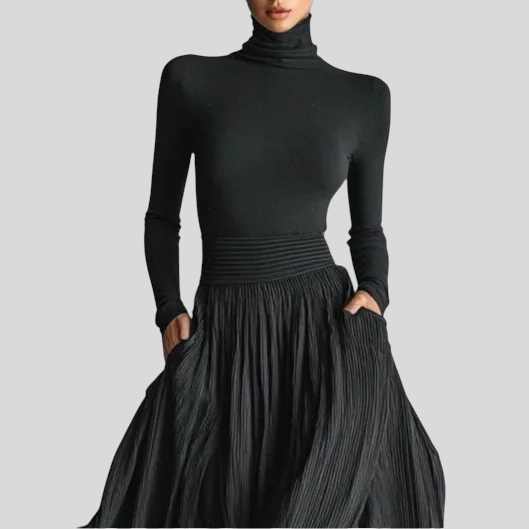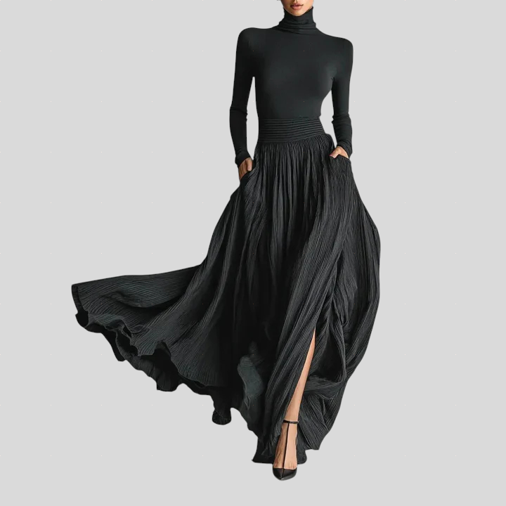 Ova duga haljina dizajnirana je da prenese eleganciju i prisutnost uz minimalan trud. Gornji dio naglašava liniju tijela, dok široka i lepršava suknja stvara lagan i dojmljiv pokret pri hodu. Udobna tkanina pruža savršen pad i prirodno prati tijelo, dajući haljini profinjen i graciozan karakter. Idealna za događaje, večere, zabave i posebne prilike u kojima stil govori sam za sebe.