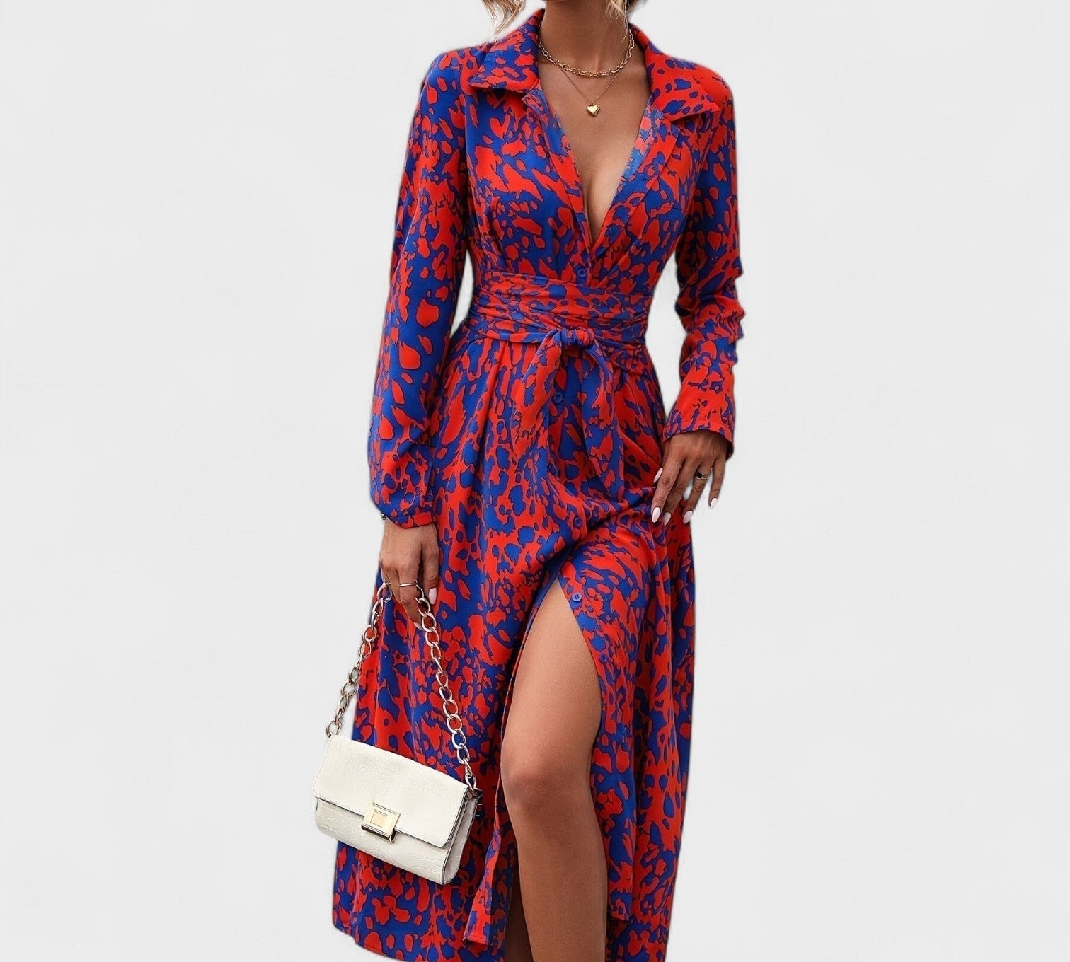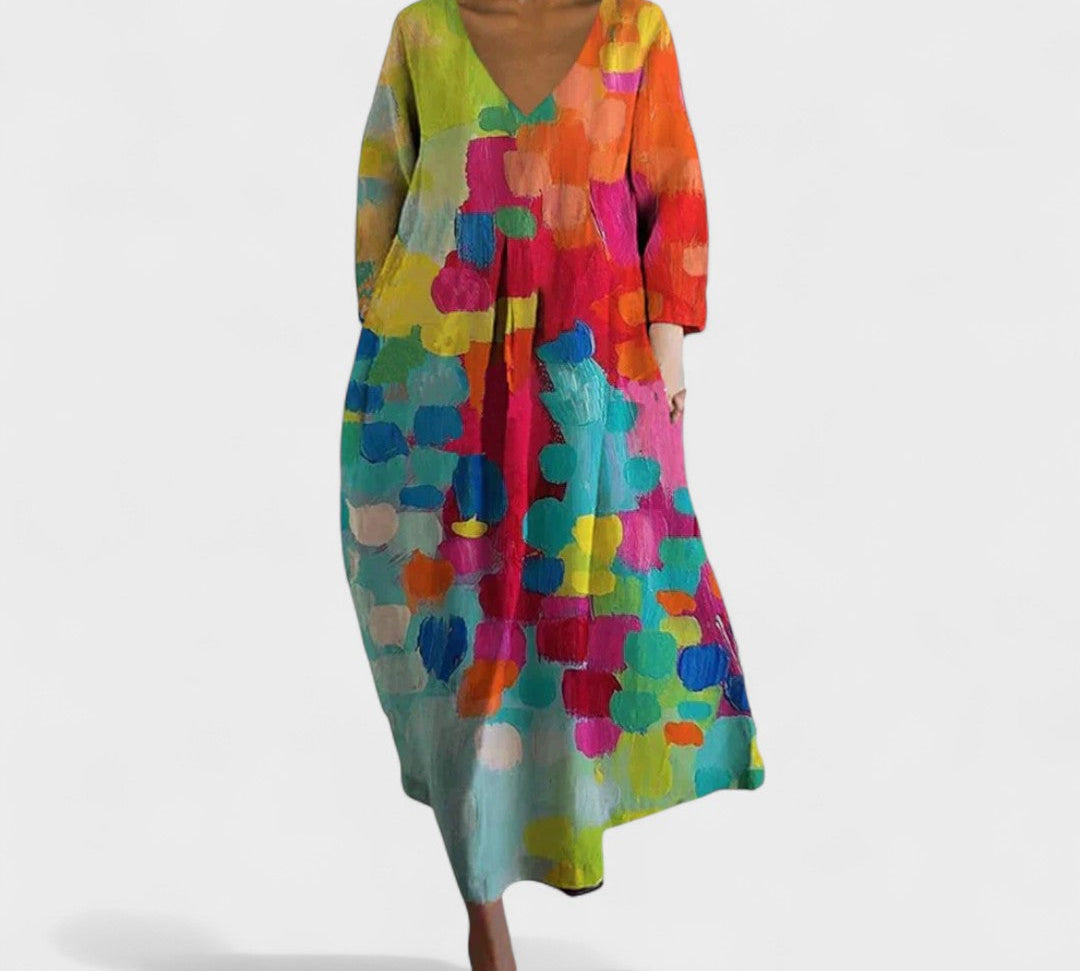 Isola™ | Opuštena midi haljina s ovratnikom na V-izrez i dugim rukavima s printom