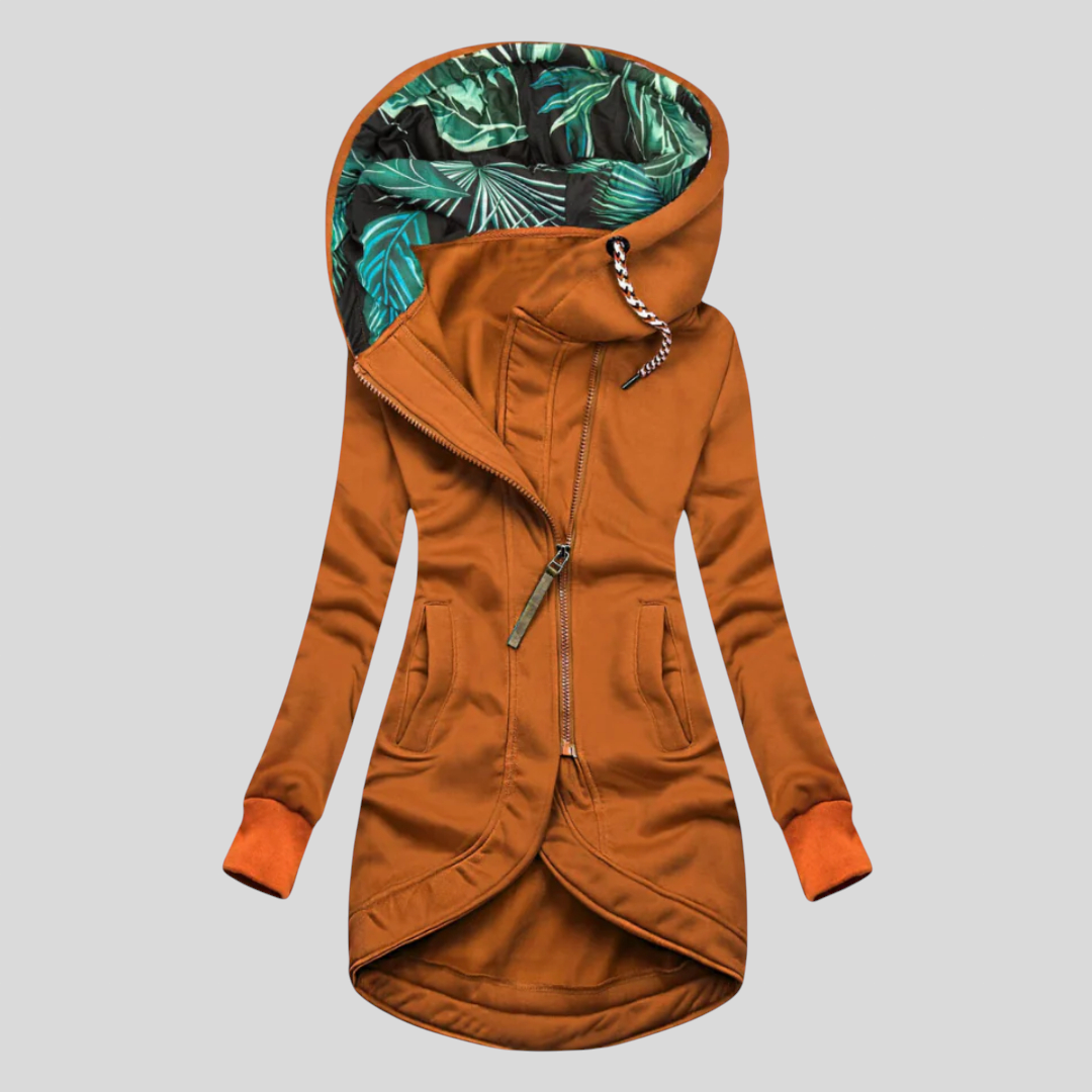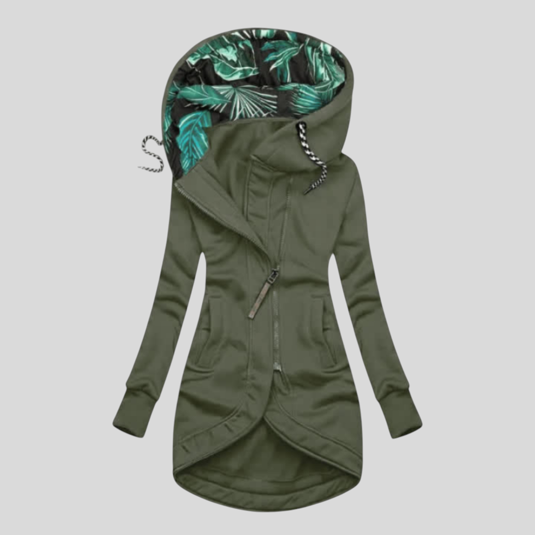 Osvježi svoj stil ovom jaknom modernog kroja i besprijekorne izrade. Asimetričan dizajn u kombinaciji s kapuljačom podstavljenom tropskim uzorkom donosi jedinstven i autentičan izgled. Savršena za one koji traže udobnost, praktičnost i eleganciju u svakodnevici.