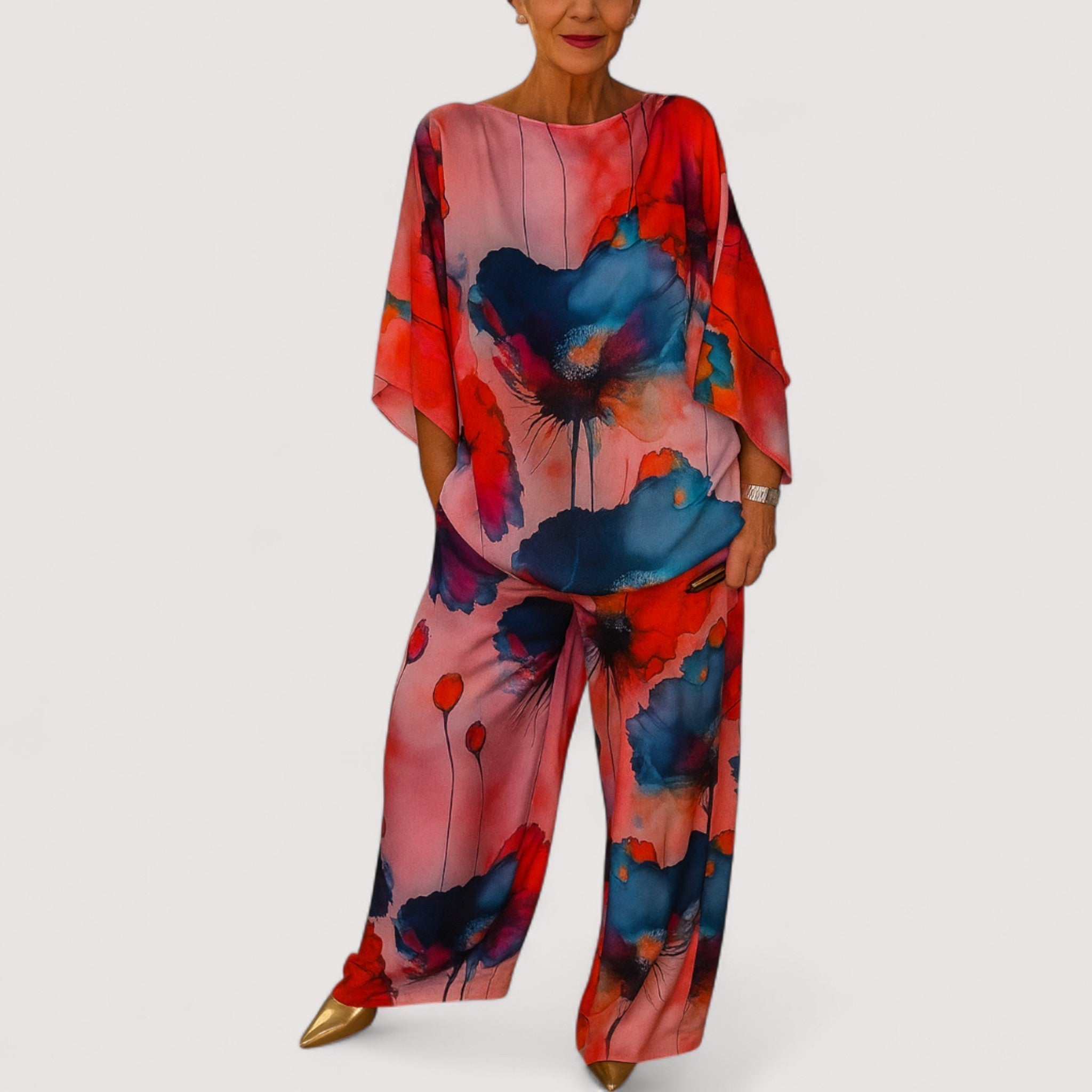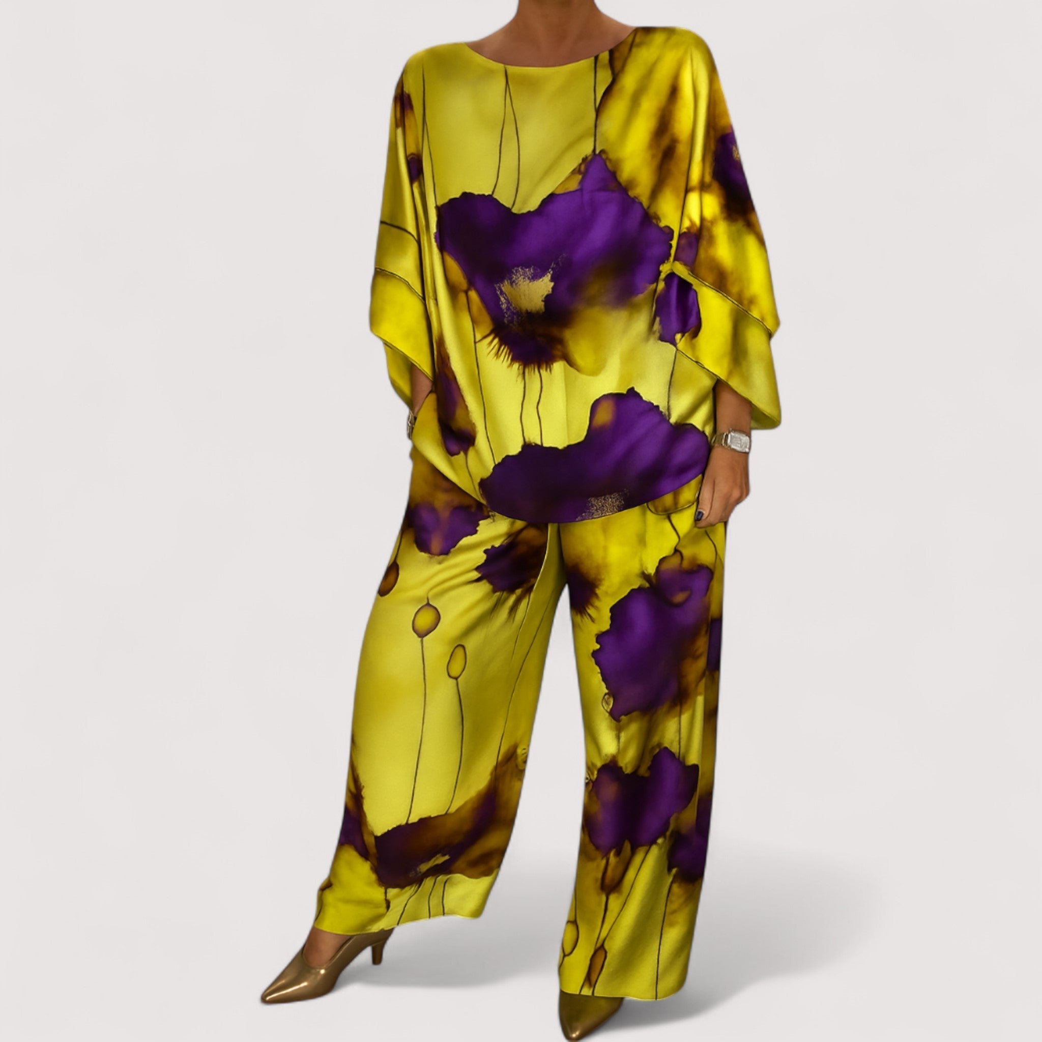 Ovaj dvodijelni komplet dizajniran je za modernu ženu koja želi privući pažnju. Nudi stil bez napora i slobodu kretanja zahvaljujući luksuznim, prozračnim materijalima – savršen od dana do večeri.