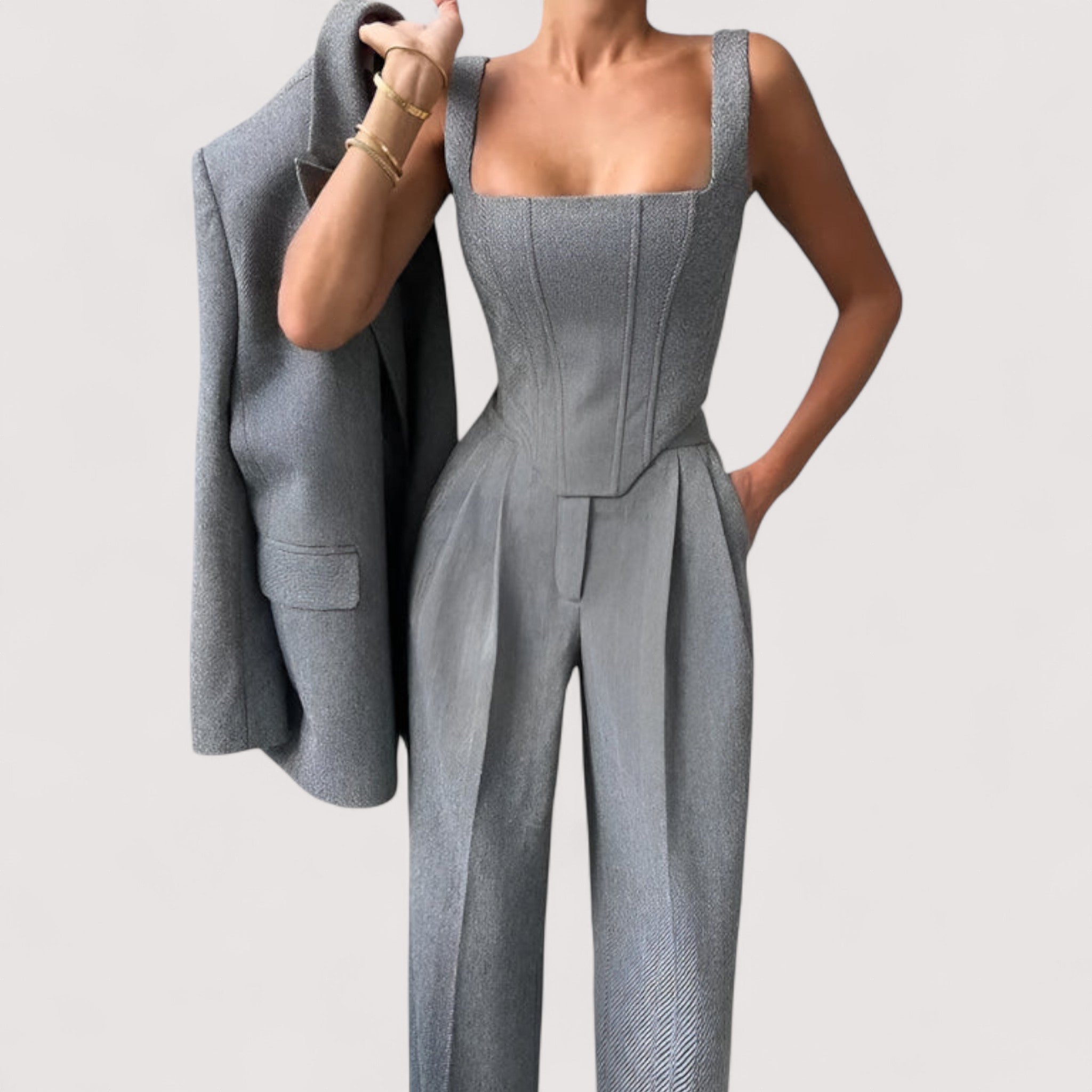 Ovaj trodijelni ansambl vješto naglašava vašu figuru i spaja impozantnu, strukturiranu eleganciju s ležernom, dinamičnom prisutnošću.
