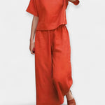 Savršen set za ljetne izglede s nenametljivom elegancijom. Zračna majica s kratkim rukavima savršeno se kombinira s udobnim hlačama opuštenog kroja, pružajući udobnost, stil i svježinu tijekom cijelog dana. Idealno za gradske lookove, odmore ili opuštene šetnje.