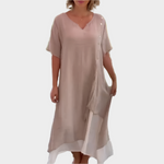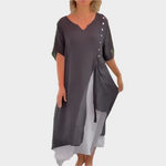 Zračite profinjenošću i udobnošću s ovom asimetričnom haljinom u nijansama plave boje. Idealna za vaše ljetne izlete, ali i za svakodnevne pojave sa stilom, ova haljina kombinira ležeran kroj s diskretnim detaljima koji čine razliku.