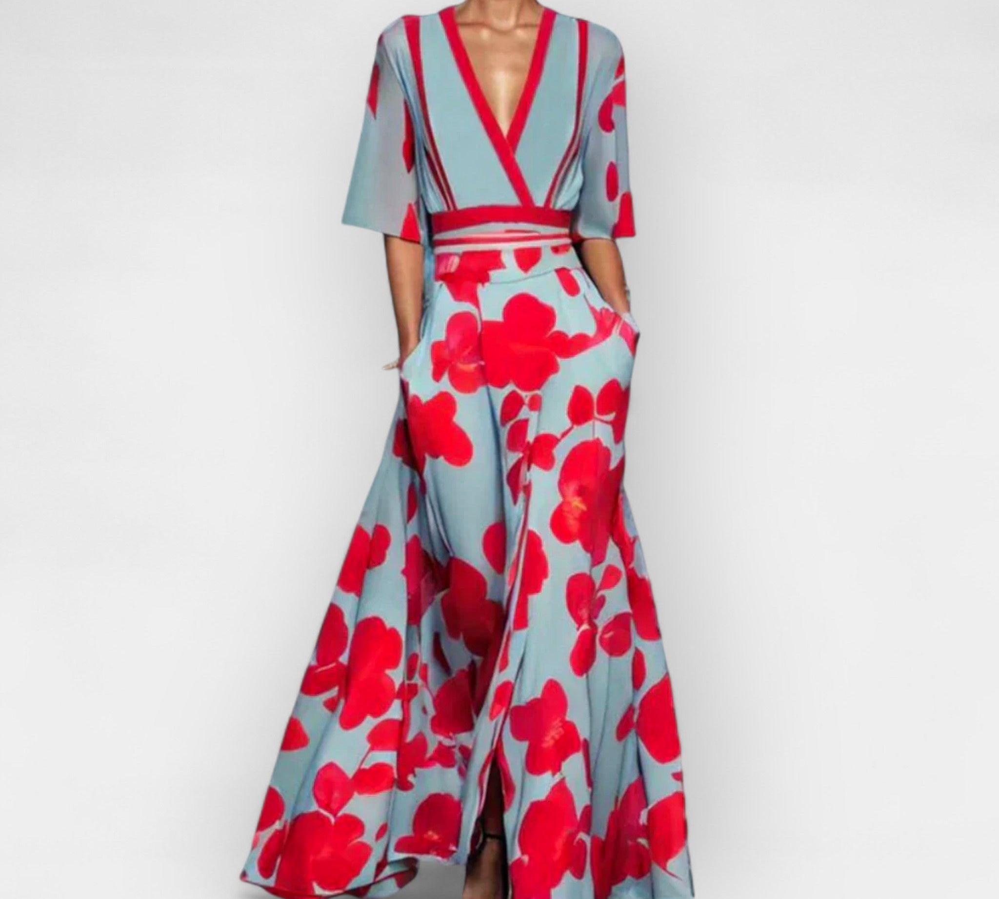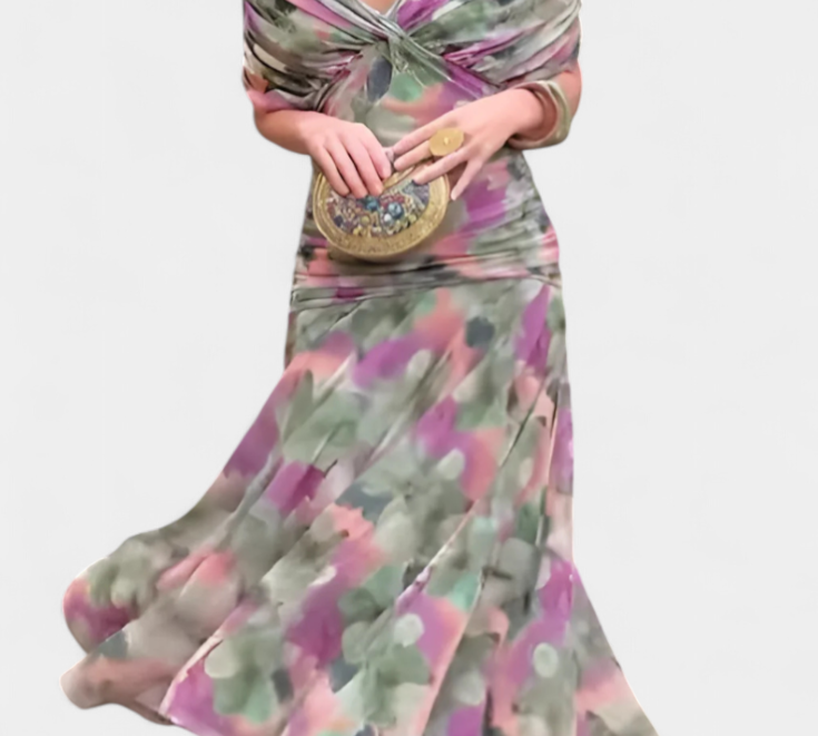 Duga haljina s cvjetnim uzorkom s V izrezom i romantičnom elegancijom