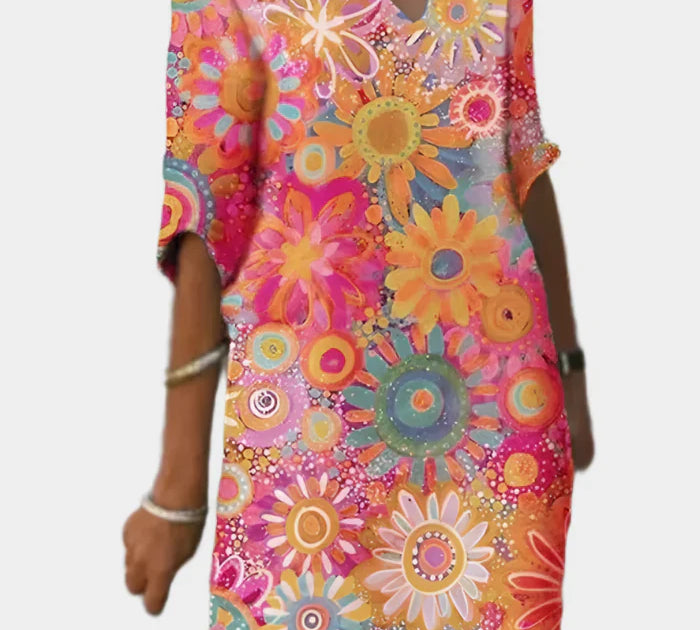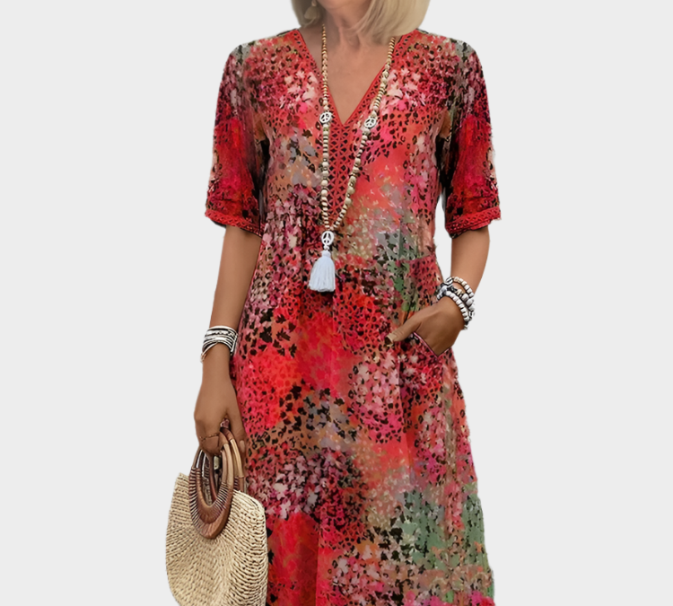 Prozračno laneno haljina s ljetnim uzorkom i V-izrezom