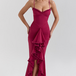 Impresivna i ženstvena haljina uskog kroja koja ističe figuru i naglašava siluetu. Detalji s volanima na dekolteu i suknji daju dozu romantike i elegancije. Idealna za večernje izlaske i posebne prigode kada želite zablistati.