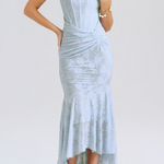 Impresivna haljina uskog kroja s reljefnim uzorkom koja elegantno prianja uz tijelo. Profilirani korzet pruža potporu i naglašava ženstvenu liniju, dok pažljivo izrađeni nabori u struku ističu siluetu. Asimetrična suknja daje pokret i dozu luksuza svakom izgledu.
