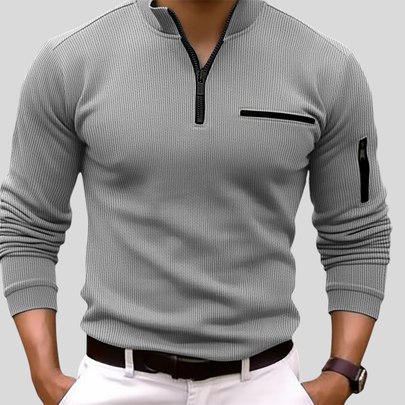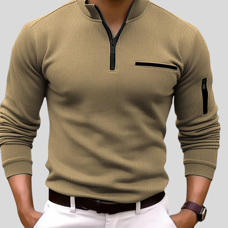 Ova polo majica dugih rukava spaja suvremeni stil i praktičnost. Rebrasta tkanina pruža udobno pristajanje i elegantan izgled, dok prednji patent dodaje sportsku, modernu notu. Džep s patentom na prsima i detalj na rukavu daju funkcionalnost i poseban karakter. Savršena je za muškarce koji žele kombinirati udobnost i sofisticiran izgled u svakodnevnim kombinacijama.