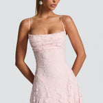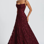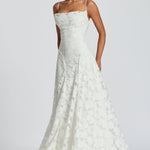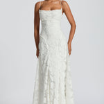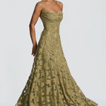Zapanjujuća maxi haljina s tankim naramenicama i nježno drapiranim gornjim dijelom koji suptilno naglašava siluetu. Teksturirani materijal s floralnim uzorkom dodaje dubinu i luksuz, dok lepršavi pad tkanine osigurava besprijekoran pokret pri svakom koraku. Savršena je za posebne prigode u kojima su elegancija, ženstvenost i profinjen stil na prvom mjestu.