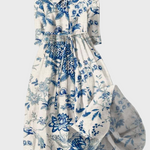 Ova prekrasna duga haljina na bijeloj podlozi s plavim cvjetnim uzorkom odiše svježinom i elegancijom. Prozračni dizajn daje romantičan dojam, dok remen u struku prirodno i ženstveno naglašava siluetu.