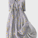 Ova šarmantna duga haljina u nježnoj lila nijansi idealan je izbor za svjež i proljetni izgled. Suptilan uzorak tratinčica u bijeloj i žutoj boji daje lepršav i veseo dojam, dok remen u struku osigurava savršeno pristajanje.