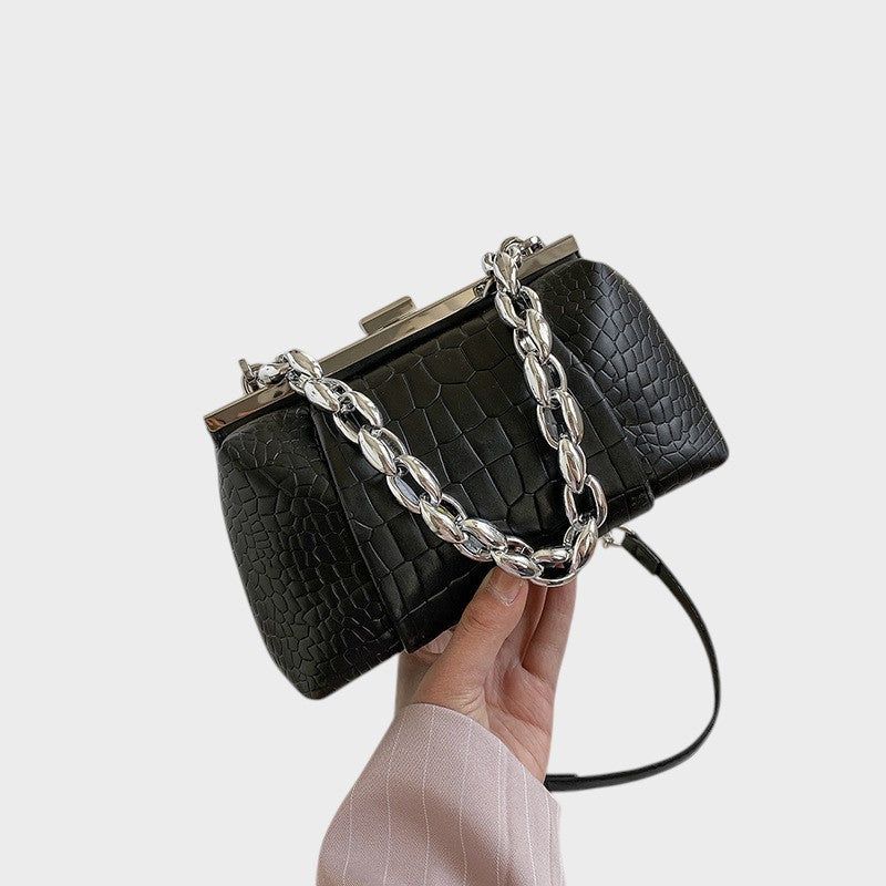 Sa teksturom krokodila i čvrstom strukturom, ova torba spaja sofisticiranost i osobnost u jednom dodatku. Njen klasični metalni zatvarač i robusna lančana ručka stvaraju modernu i upečatljivu kontrast. Idealna je za one koji traže kompaktni, praktični komad s jakom prisutnošću, bilo za dan ili noć.