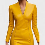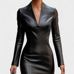 Ova uska haljina od umjetne kože savršen je izbor za žene koje žele istaknuti svoju samouvjerenost i sofisticiranost. Moderni kroj koji prati liniju tijela naglašava figuru, dok materijal visokog sjaja daje odvažan i luksuzan izgled. Idealna je za večernje izlaske, posebne događaje ili trenutke kada želite ostaviti snažan dojam.